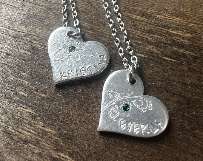 Birth Flower Heart Necklace with Personalized Name, Custom Birthstone , Valentines, Birthday, Anniversary, Graduation, Grandma, New Mom Gift
